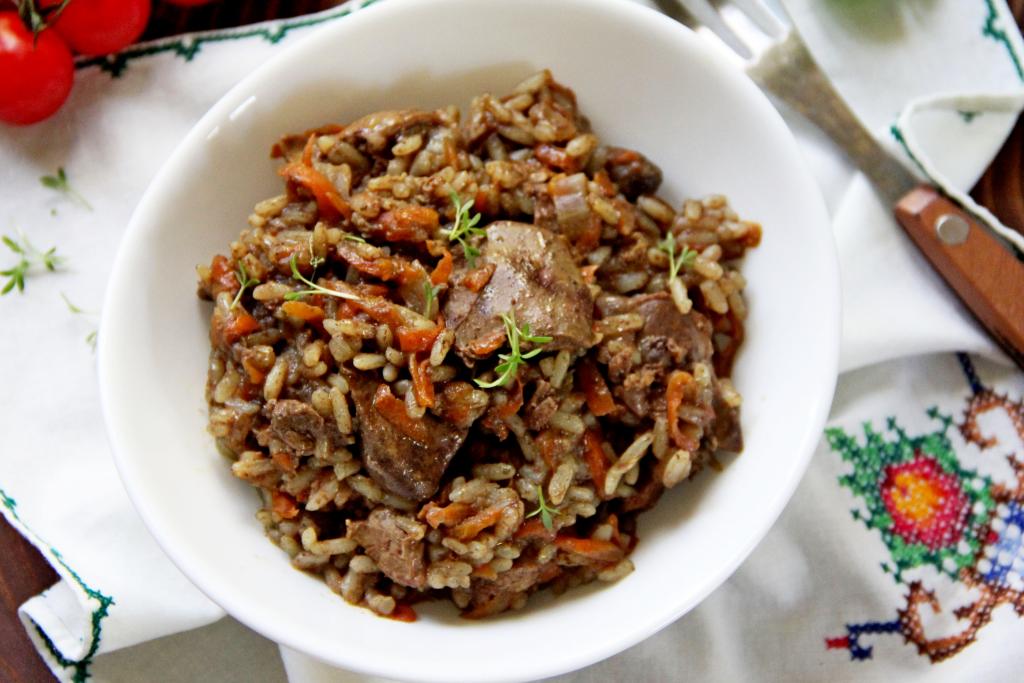 Рассыпчатый рис вместе с мягкой, нежной куриной печенью разложить со сковороды по тарелкам и в горячем виде подать сытное, аппетитное и вкусное блюдо к столу.