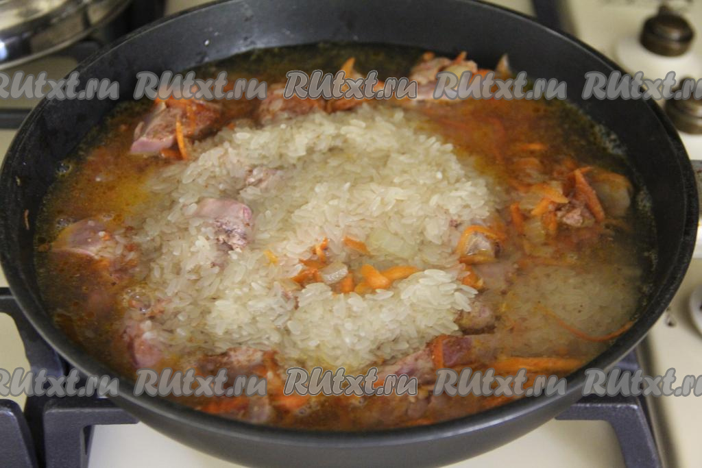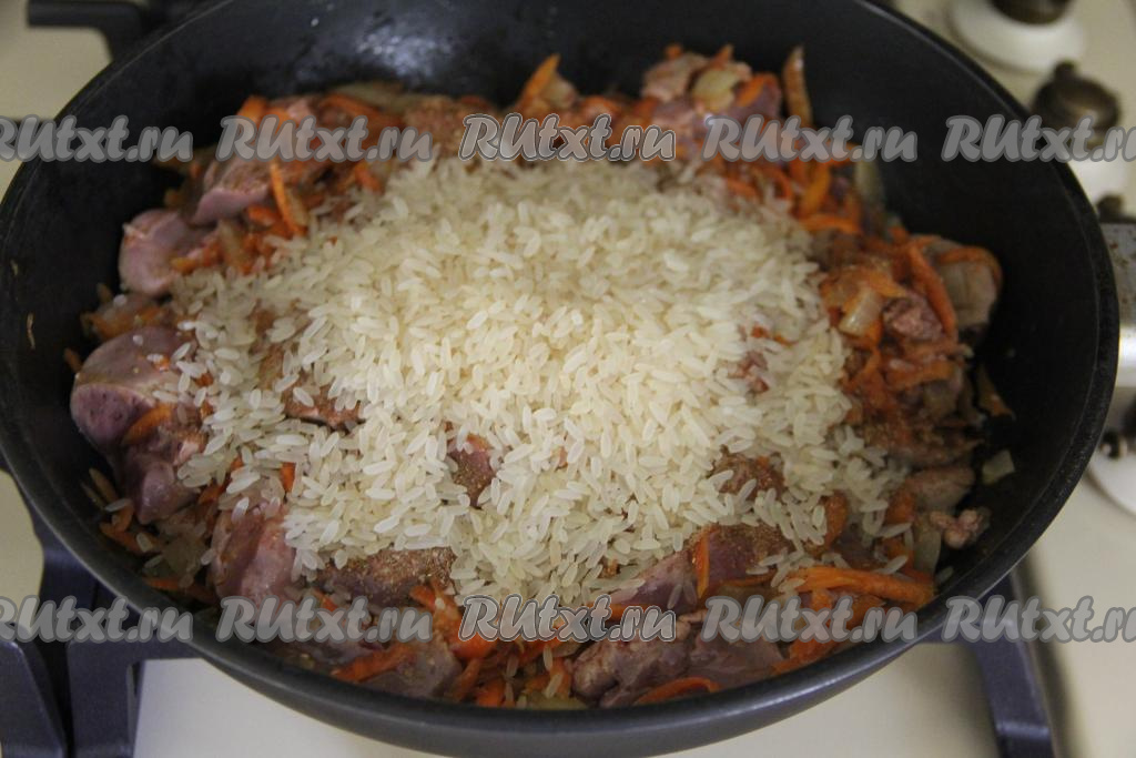 Обжарить печёнку с овощами в течение 3-4, периодически перемешивая. Затем всыпать рис.