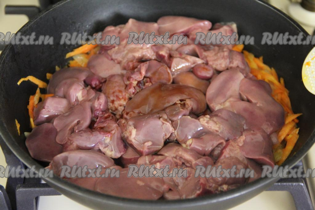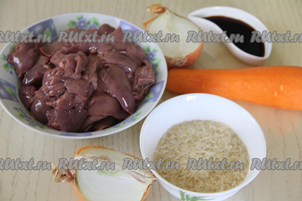 Подготовить продукты. Лук и морковь почистить. Куриную печень промыть водой и немного обсушить. Рис всыпать в сито и тщательно промыть под проточной водой, после этого оставить на несколько минут, чтобы стекла лишняя жидкость.