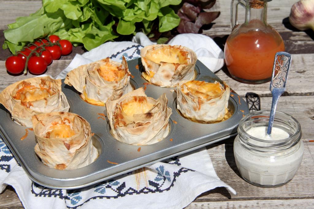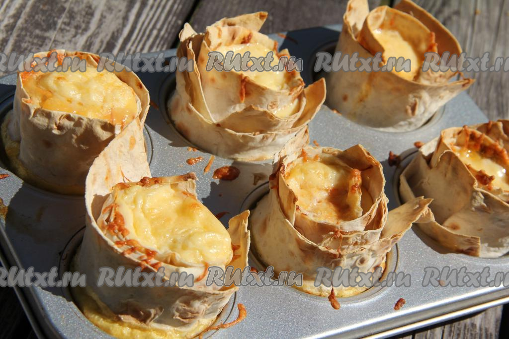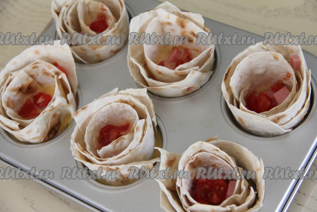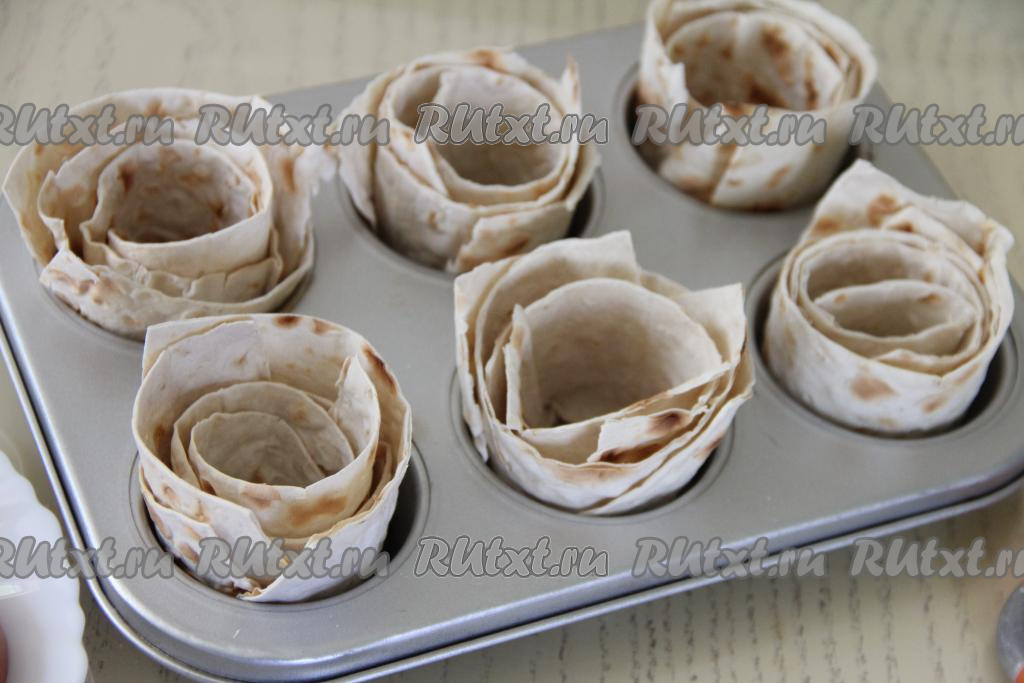 Формы для кексов смазать растительным маслом. В каждую формочку выложить рулетик из лаваша в виде розочки (я выкладывала в 6 формочек).