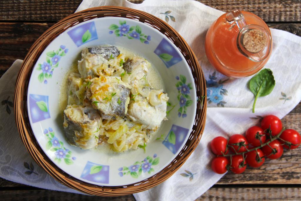 Хека нарезать на порционные кусочки и выложить в сковороду к обжаренному луку. Посолить и поперчить рыбу по вкусу.