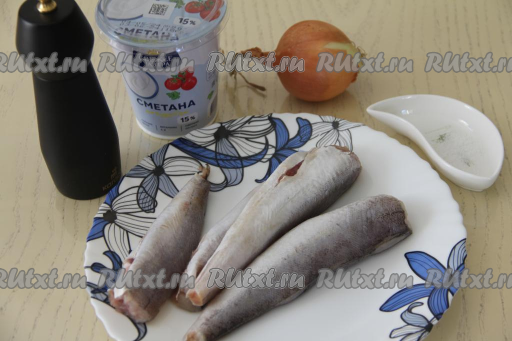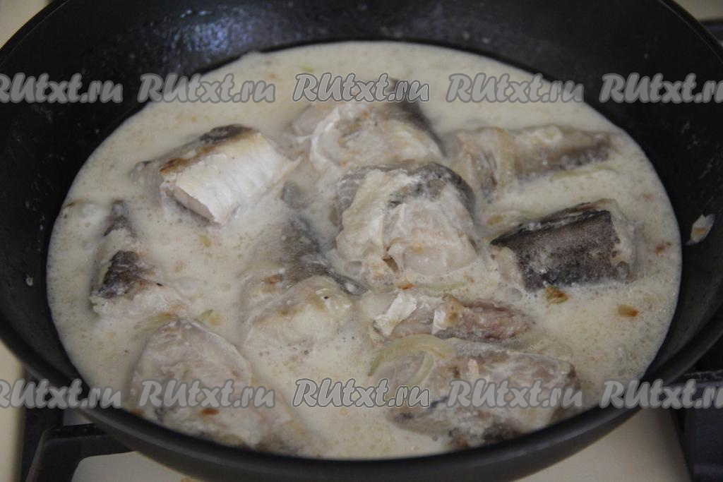 В отдельной ёмкости соединить сметану с водой, перемешать сметанный соус. После того как хек обжарится до золотистости с двух сторон, влить в сковороду сметанный соус.