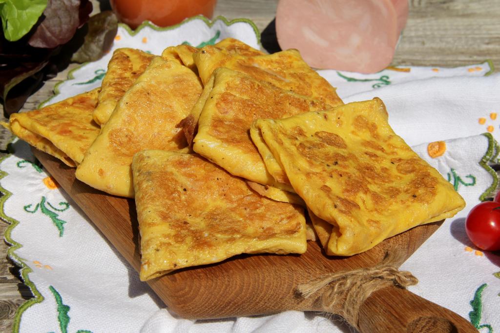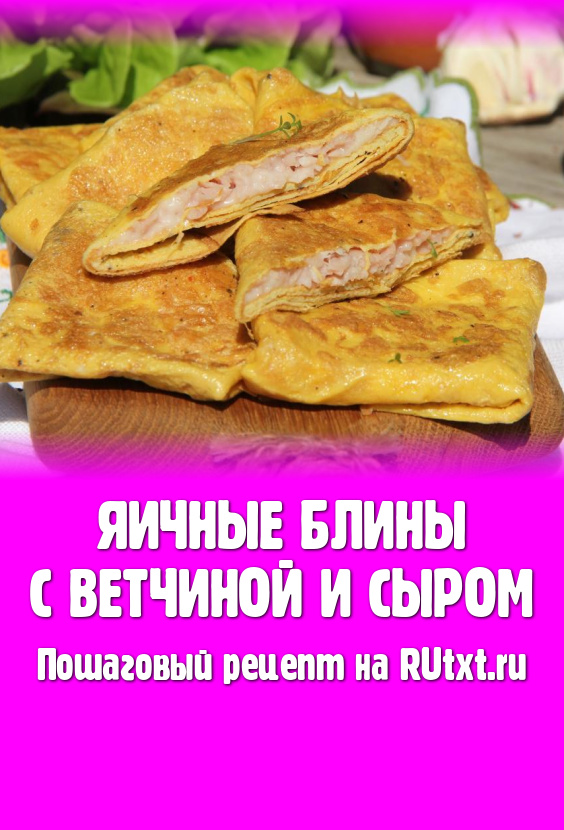 Вкусные, нежные яичные блины, приготовленные с ветчиной и сыром, можно подавать к столу как в тёплом, так и в холодном виде.