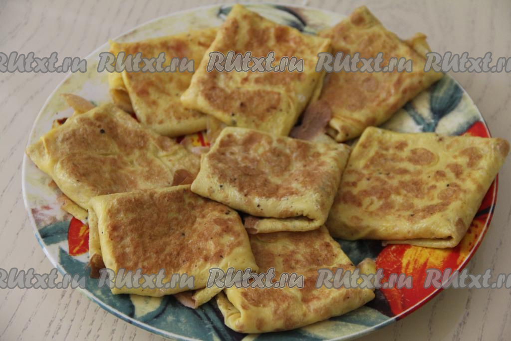 Готовый яичные блин, фаршированный ветчиной и сыром, переложить на тарелку. Смазывая сковороду маслом перед жаркой очередного блина, постепенно приготовить все конвертики с ветчиной и сыром (у меня получилось 8 штук).