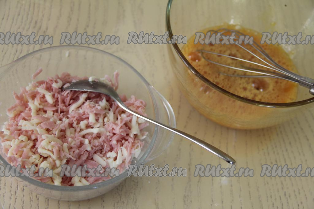 Взбить яйца венчиком до однородности. Сыр и ветчину натереть на крупной тёрке в отдельную глубокую тарелку, перемешать.
