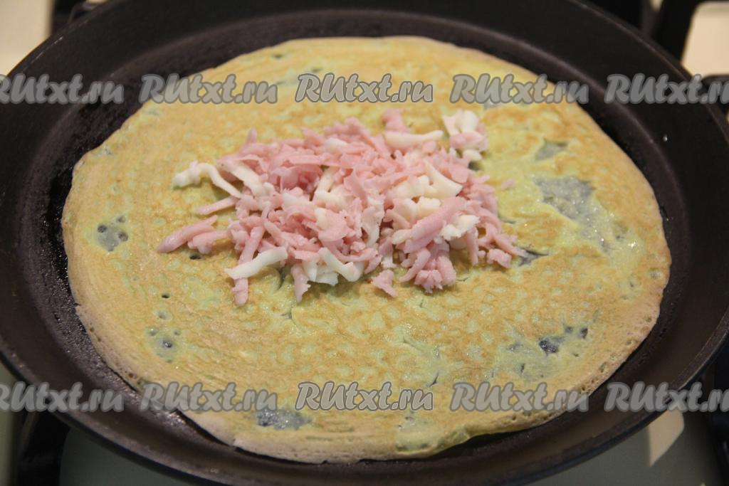 Аккуратно перевернуть яичный блин и выложить на середину 1 столовую ложку начинки из ветчины и сыра.