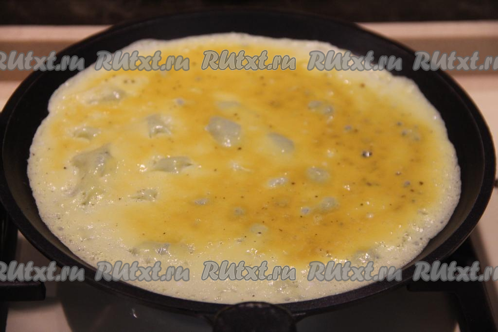 Сковороду разогреть и смазать растительным маслом. Влить 1/2 половника яичной массы в сковороду и равномерно распределить. Жарить яичный блин на среднем огне, пока низ блинчика не схватится.