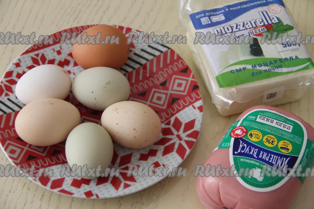 Подготовить продукты. Я использовала сыр "Моцарелла", можно взять любой сыр на ваш вкус. Ветчину можно заменить на любую колбасу.