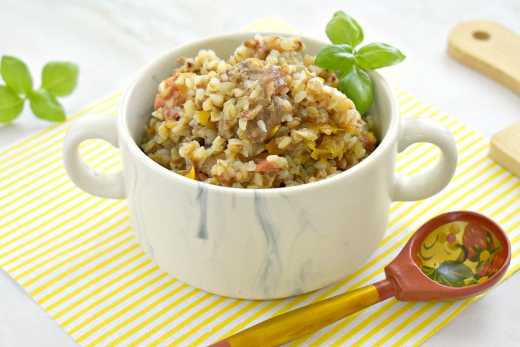 Гречневую крупу, если нужно, перебираем, затем тщательно промываем под проточной водой и добавляем к индейке и овощам, по вкусу солим.