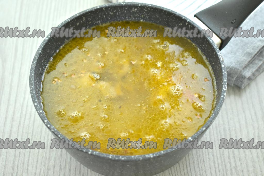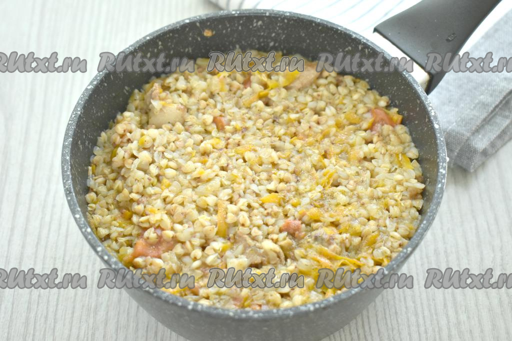 Убавляем огонь, накрываем крышкой и готовим минут 20-25 (до испарения воды и мягкости гречки).