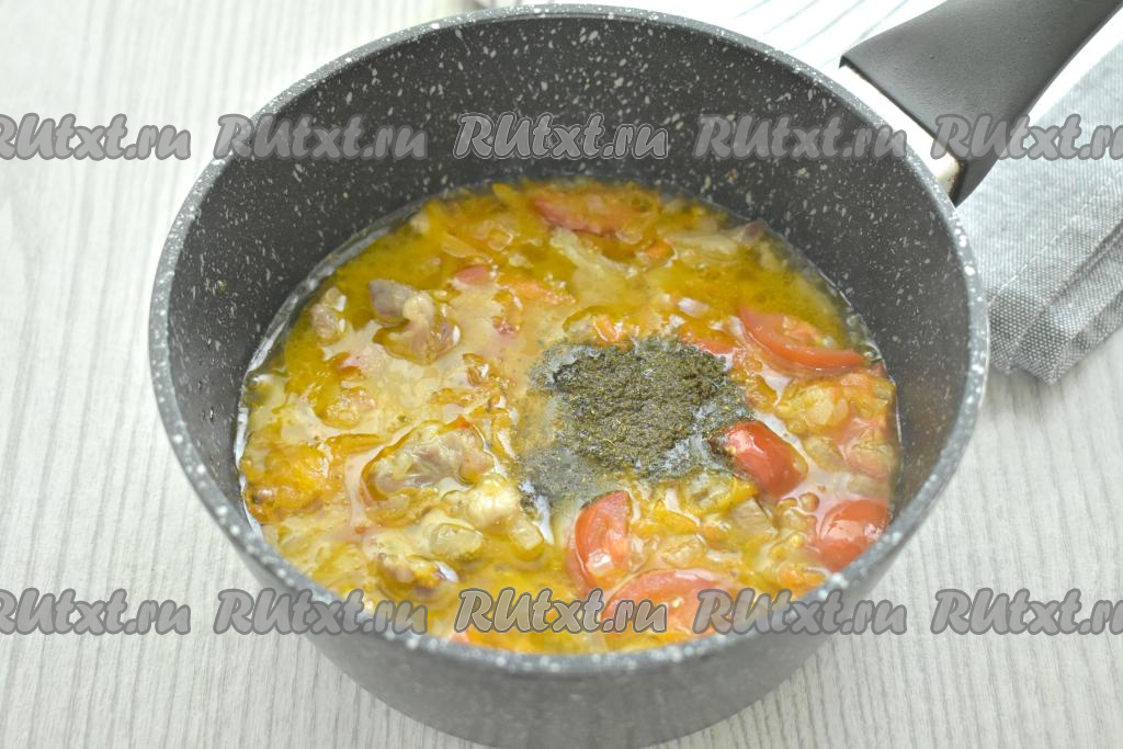К индейке, обжаренной с овощами, вливаем 100 миллилитров воды, всыпаем специи (я использовала чёрный молотый перец и хмели-сунели). Даём воде закипеть, убавляем огонь до минимума и тушим индейку с овощами под крышкой 10 минут.