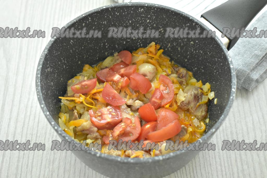 Затем добавляем нарезанный на небольшие кусочки помидор (по желанию, с помидора предварительно можно снять кожицу), перемешиваем и обжариваем овощи 2-3 минуты, не забывая периодически перемешивать.