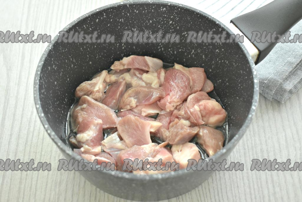 Для этого блюда можно взять мясо с любых частей индейки (например, с грудки, крыльев или голени). Филе индейки моем, обсушиваем, нарезаем на небольшие кусочки, солим. В сотейнике (или в глубокой сковороде) разогреваем растительное масло, выкладываем нарезанное мясо, обжариваем, периодически перемешивая, 5 минут на среднем огне.