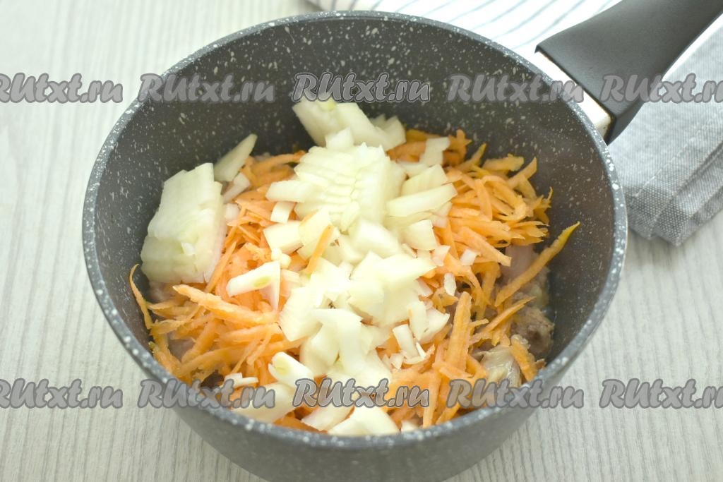 Сразу же добавляем лук, нарезанный на небольшие кусочки, перемешиваем и обжариваем минут 5-7 (морковка должна стать мягкой), иногда помешивая.