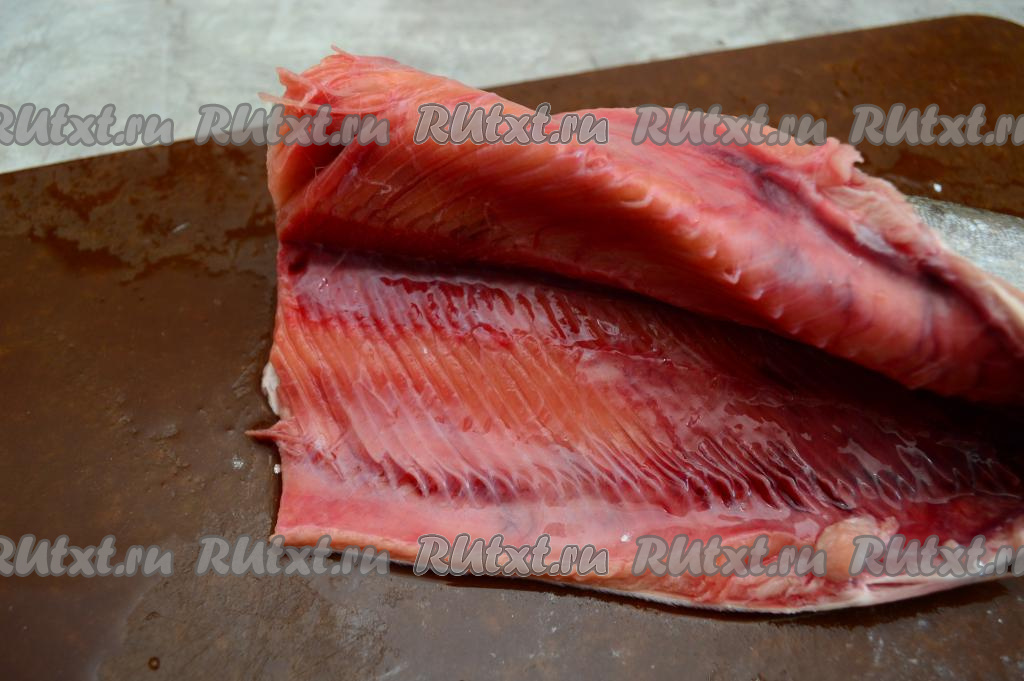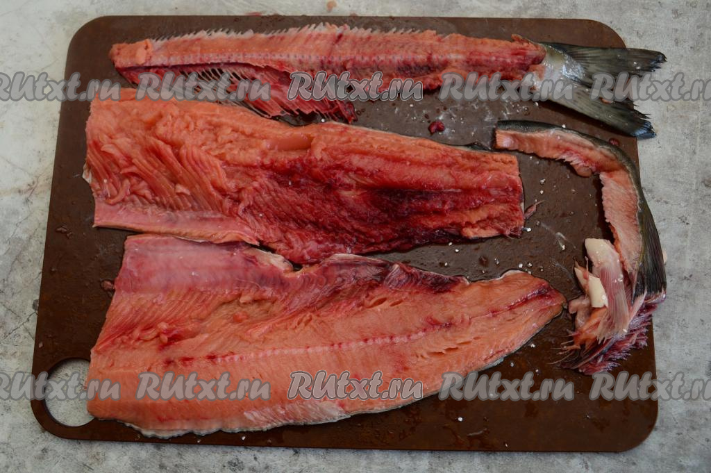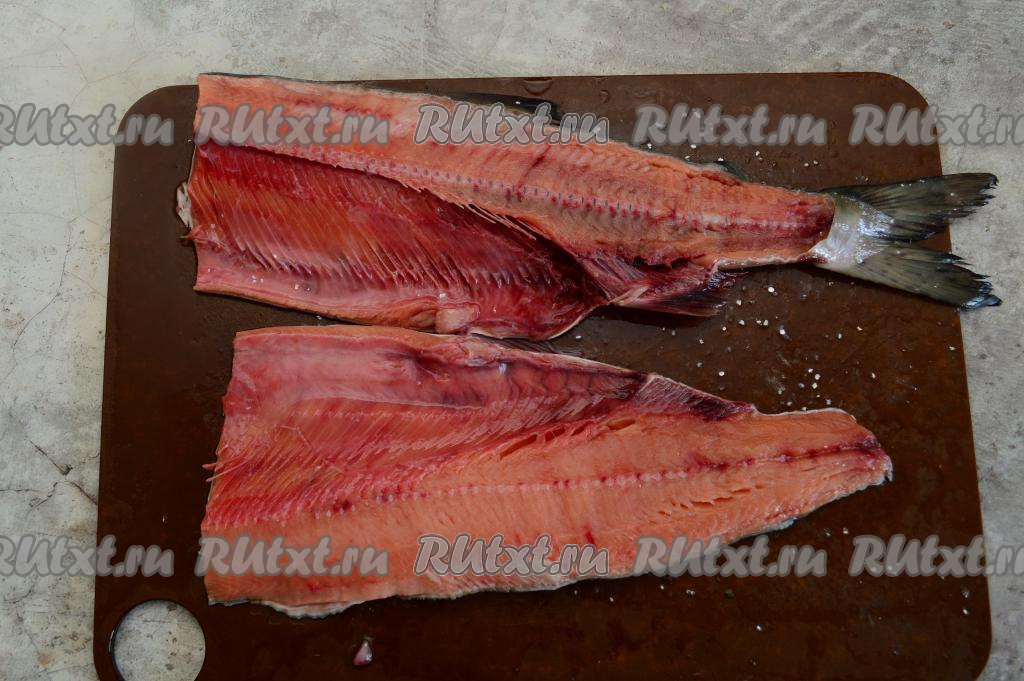 Острым ножом разрезать горбушу по хребтовой кости, чтобы получилось два филе.