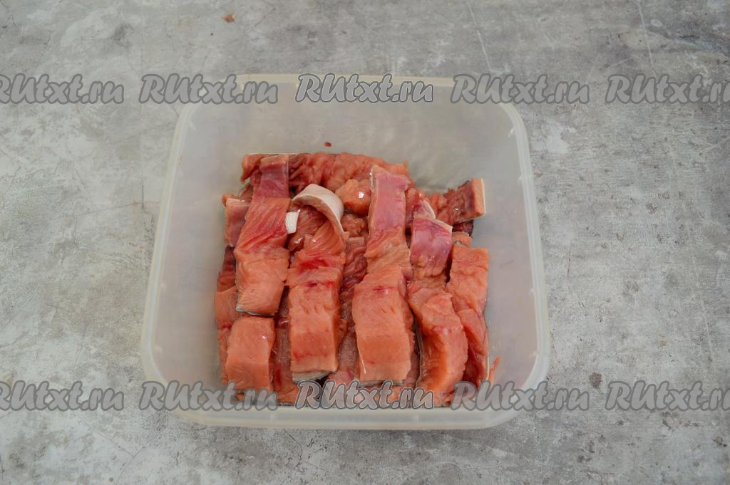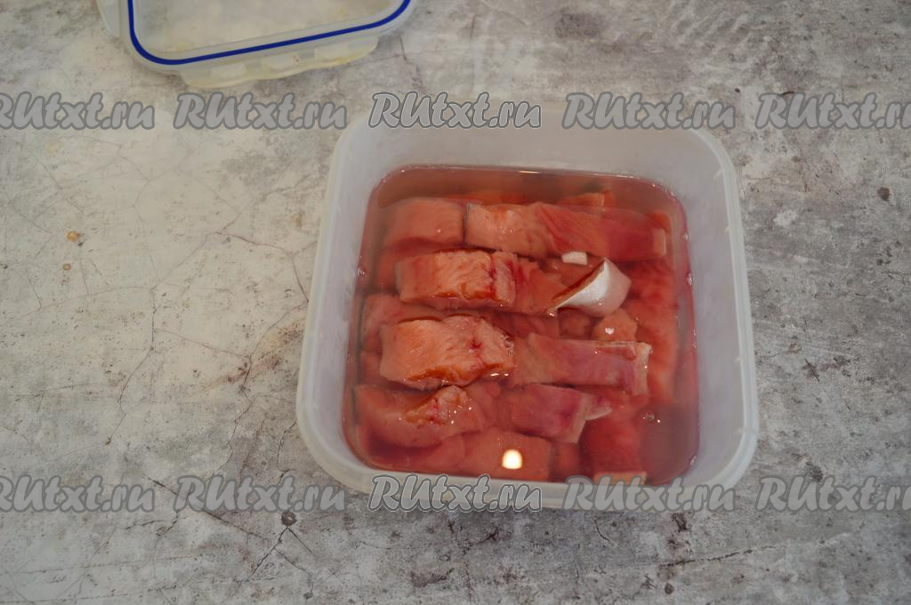 Сложить кусочки горбуши в подходящую посуду. Я сложила в пластиковый контейнер.