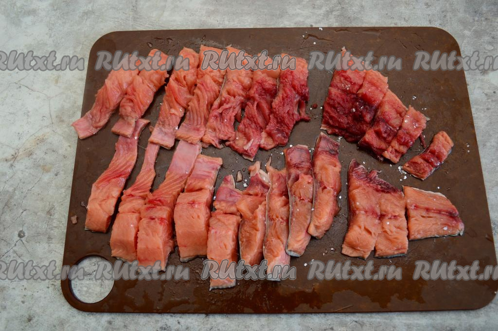 Два полученных филе горбуши нарезать на кусочки шириной около 2 сантиметров.
