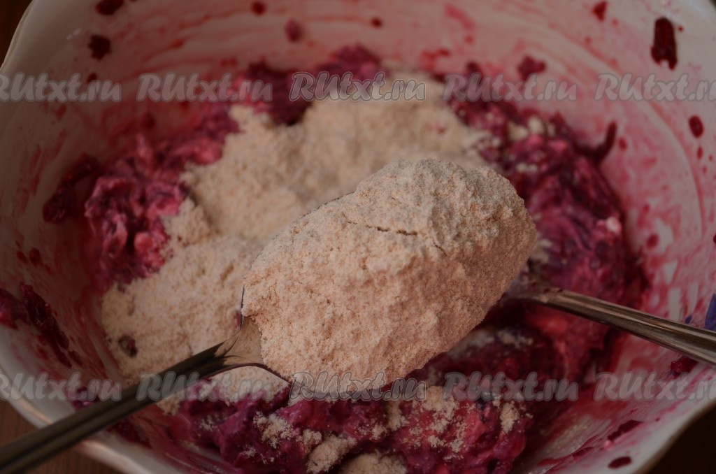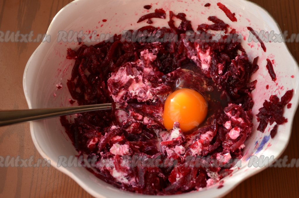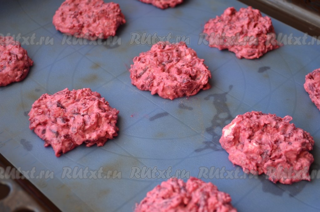 Столовой ложкой сформировать на противне или силиконовом коврике оладьи из свеклы. Выпекать в разогретой духовке 30-35 минут при температуре 190 градусов.