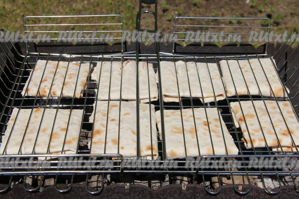 Обжаривать конвертики из лаваша без прямого огня, только используя жар углей, до лёгкого подрумянивания и расплавления сыра (я жарила 5 минут), часто переворачивая решётку.