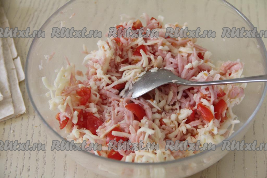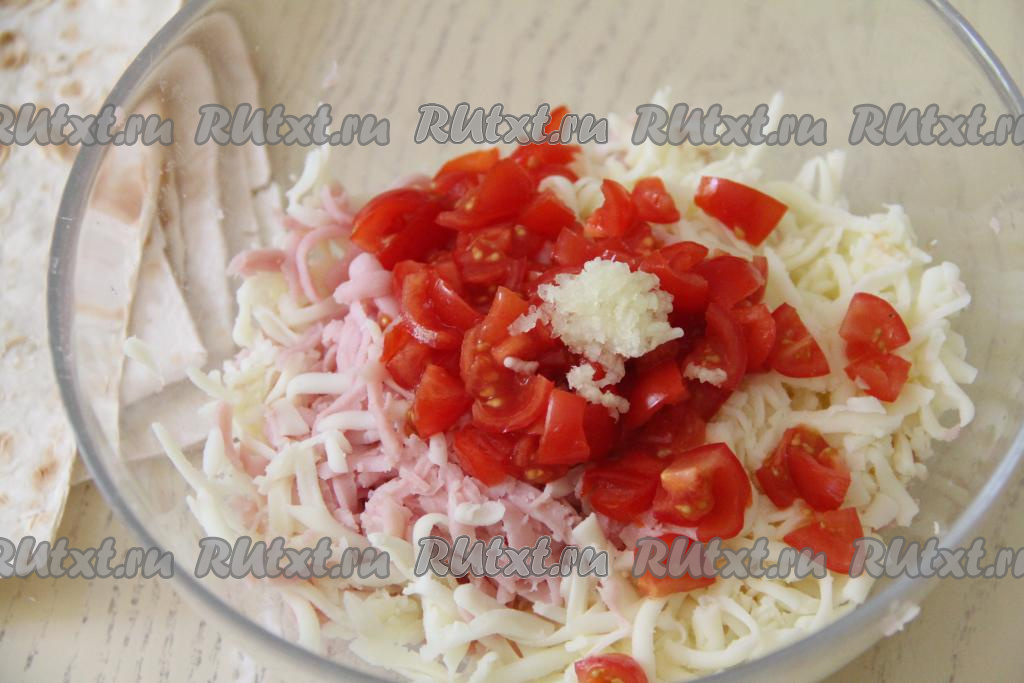 Добавить помидоры в миску к сыру и ветчине, туда же выдавить чеснок через пресс.