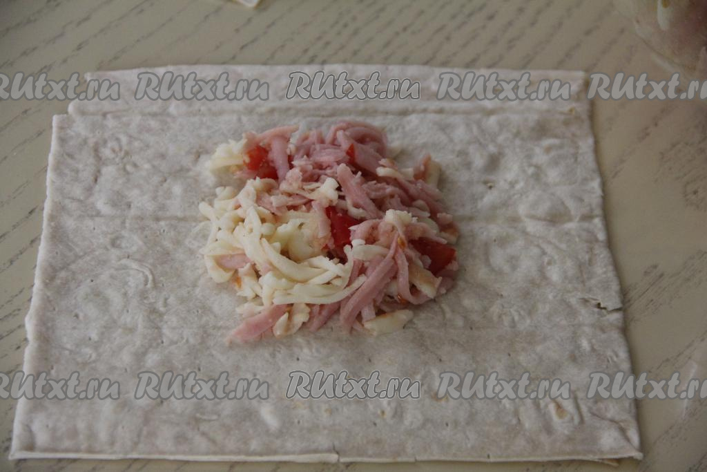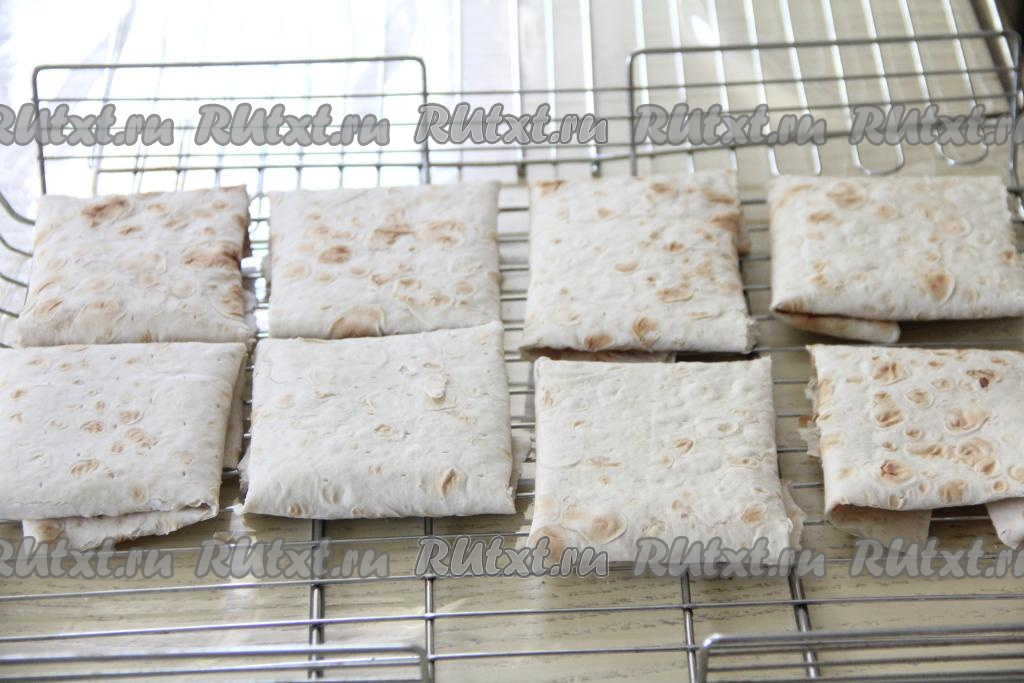 Таким образом сформировать квадратные конвертики из оставшейся начинки и прямоугольников из лаваша. Выложить все 8 конвертиков на решётку в один слой.