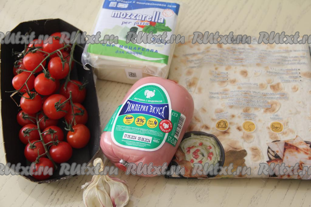 Подготовить продукты. Вместо ветчины можно взять любую варёную колбасу на ваш вкус. Помидоры черри можно заменить на обычные.