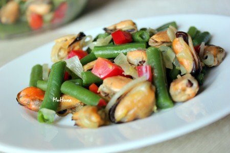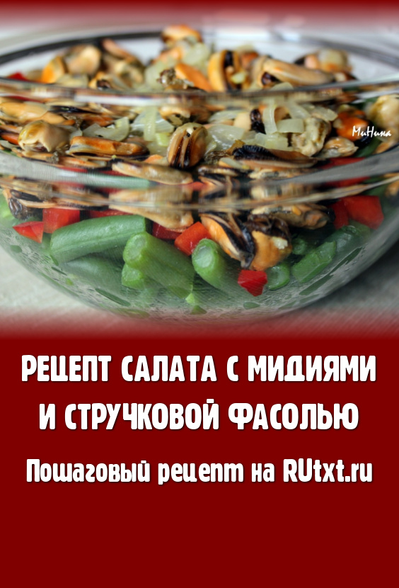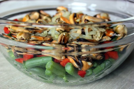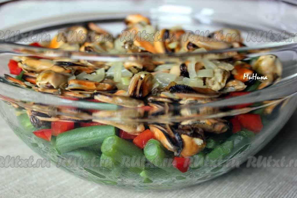 Салат с мидиями и стручковой фасолью готов.