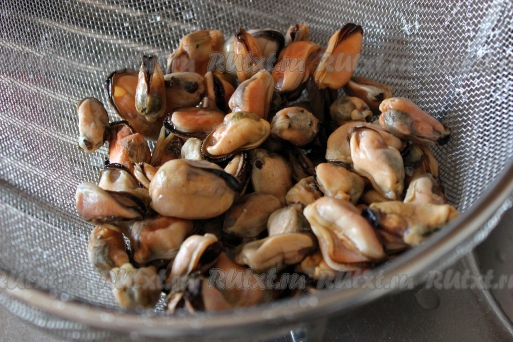 Замороженные мидии ошпарить для удаления с них ледяной глазури.