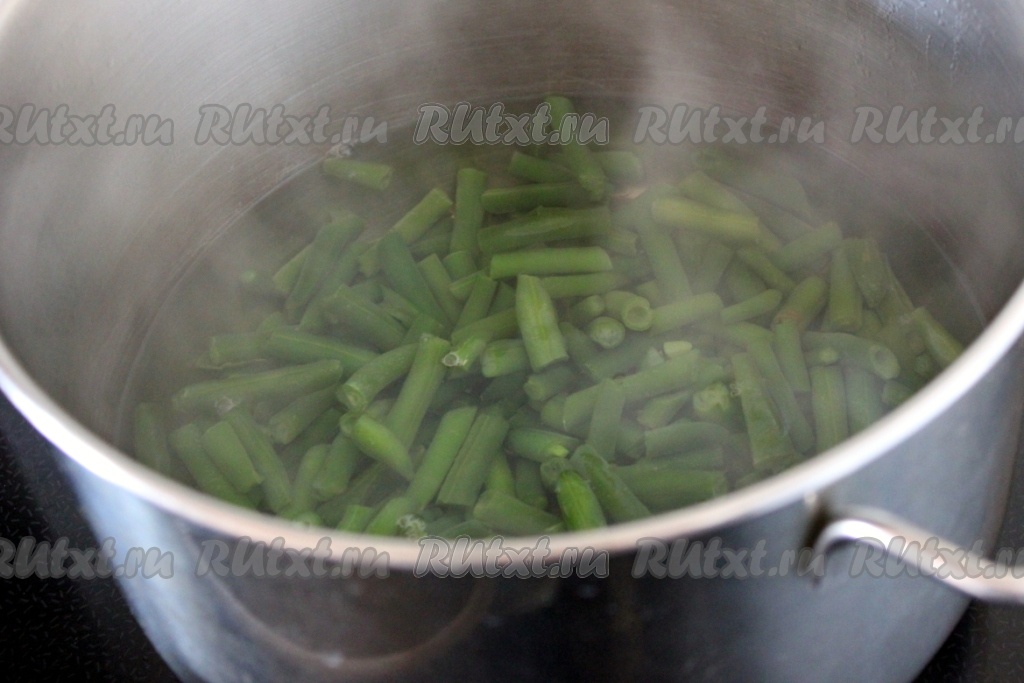 Посолить воду, довести до кипения, убавить огонь до среднего и варить фасоль стручковую 5 минут.