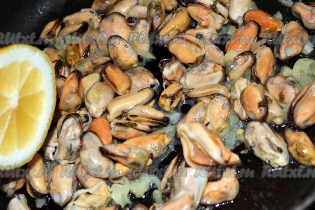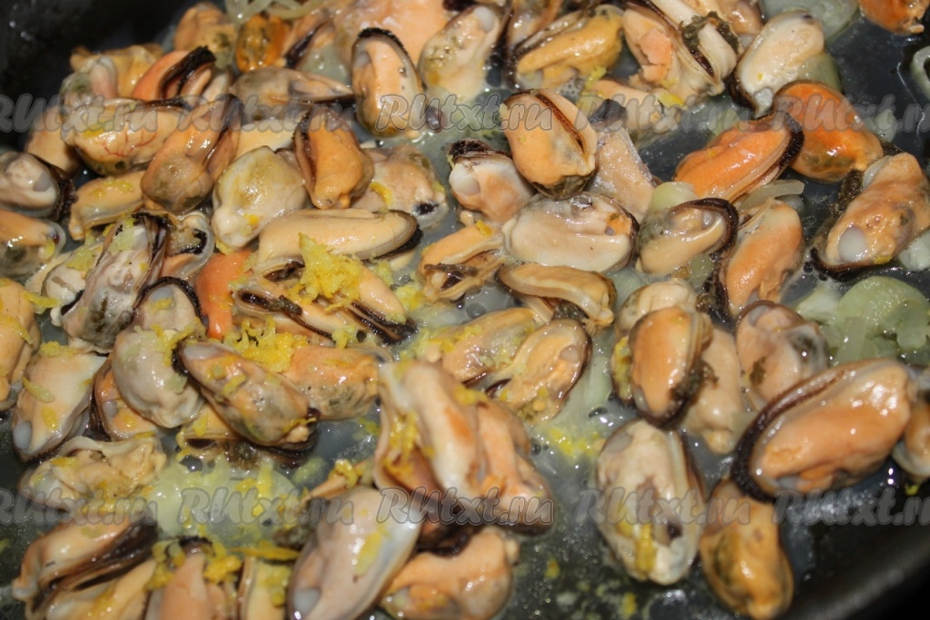 Репчатый лук нашинковать, немного обжарить на оливковом масле, добавить мидии, пожарить всё вместе около пяти минут, добавить лимонную цедру и полить лимонным соком.