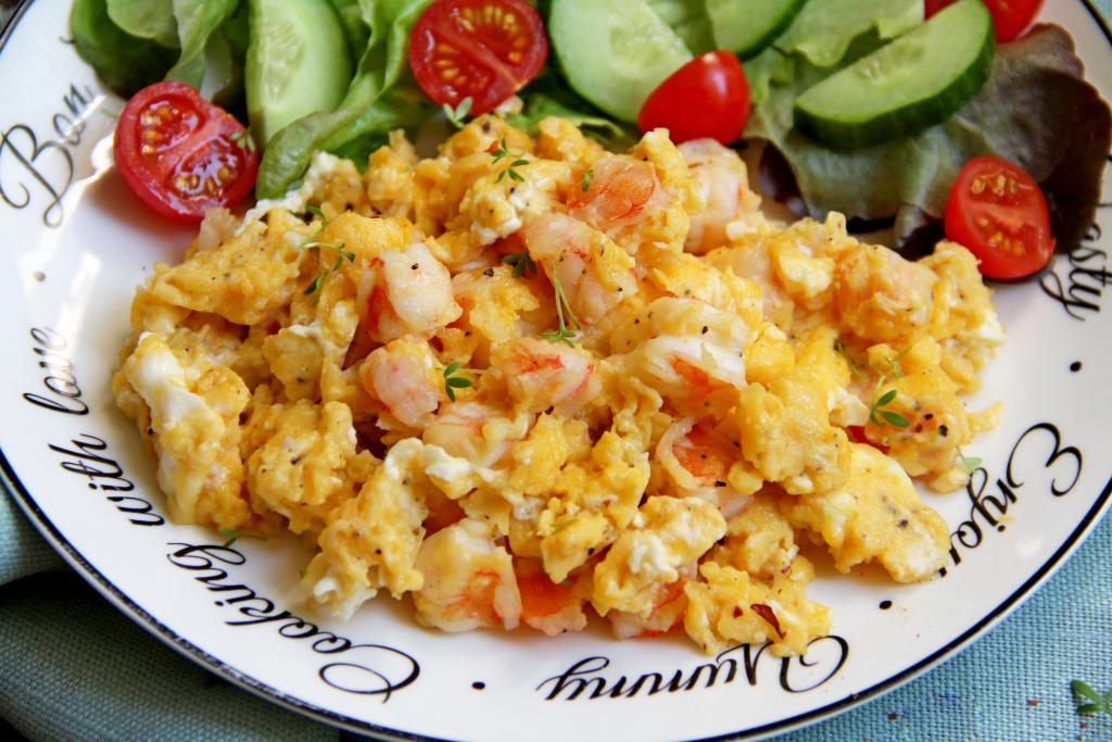 Готовый скрэмбл с креветками переложить со сковороды на тарелку и подать к столу в горячем виде. Аппетитно, сытно и очень вкусно, попробуйте!