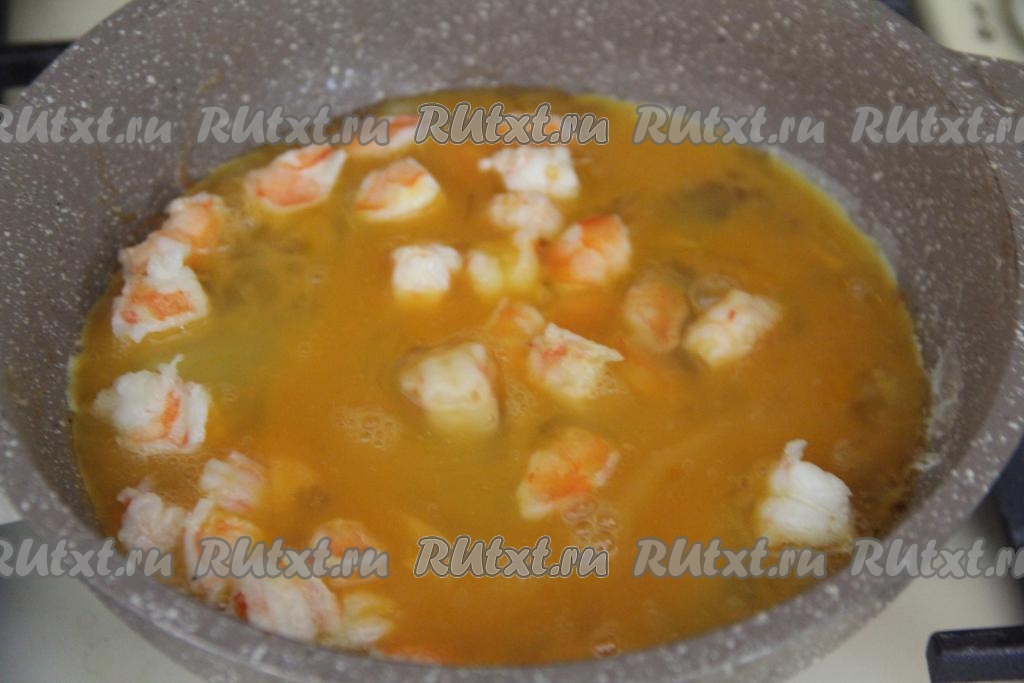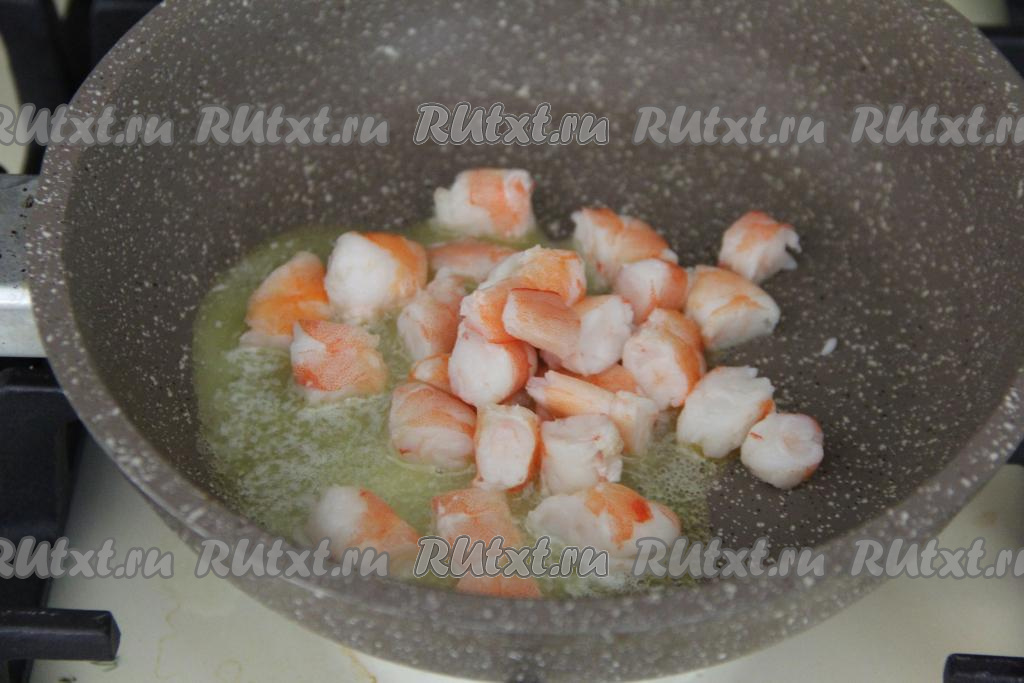 В сковороду выложить сливочное масло и разогреть. Если у вас крупные креветки, тогда нарежьте их на кусочки. Добавить креветки в сковороду и обжаривать их 1 минуту на среднем огне, периодически помешивая.