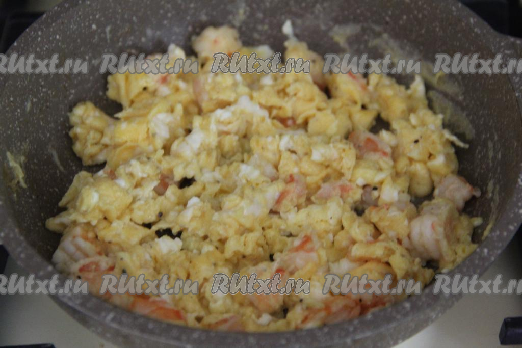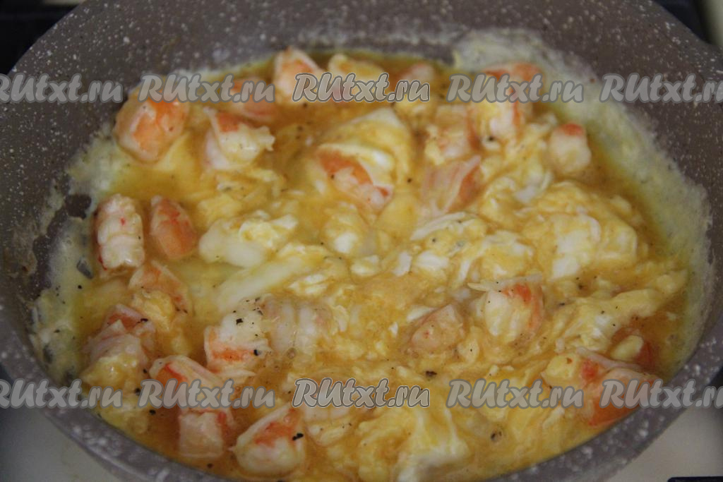 Влить яичную смесь в сковороду с обжаренными креветками.