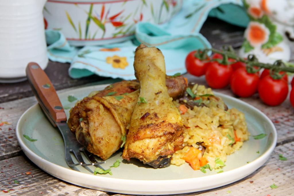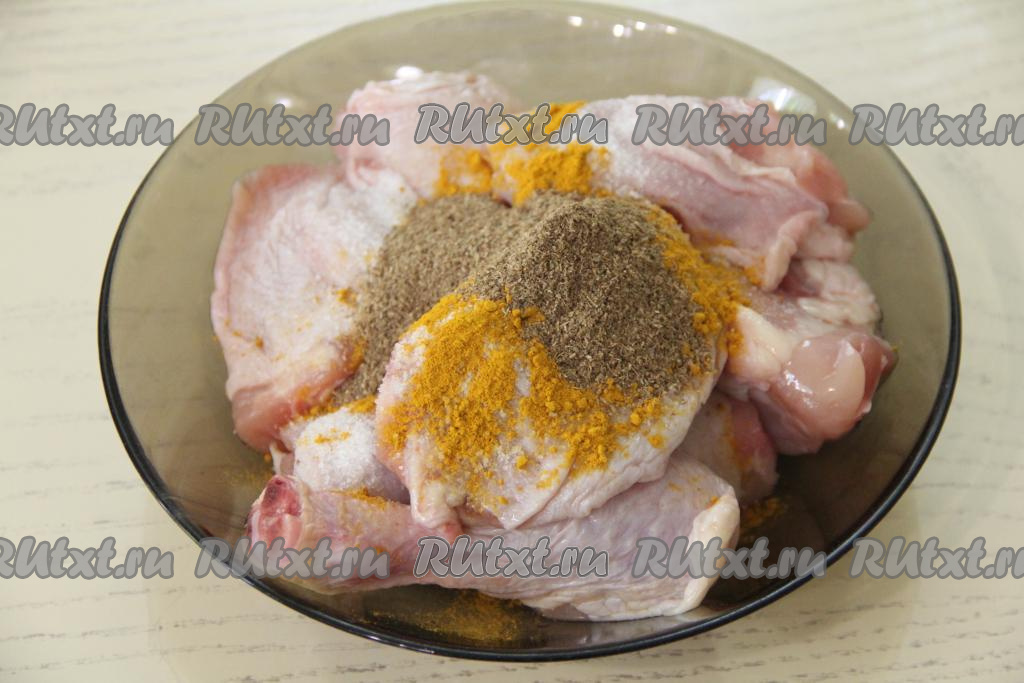 Части курицы промыть и обсушить, выложить в миску, всыпать специи (я добавила 1/4 чайной ложки куркумы и 1 чайную ложку карри) и соль. Тщательно перемешать, покрывая курицу специями и солью со всех сторон.