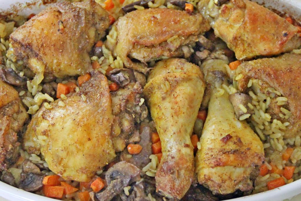 Для семейного обеда или ужина можно приготовить в духовке рис с курицей и грибами. Рис получается очень вкусным, рассыпчатым, пропитанным мясным соком. Кусочки курицы в процессе запекания становятся хорошо пропаренными, покрытыми сверху золотистой корочкой, а шампиньоны делают блюдо более насыщенным и ароматным. Просто, сытно и очень вкусно, попробуйте!