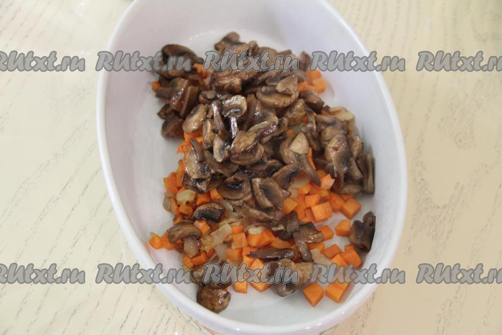 В жаропрочную форму выложить обжаренные овощи и грибы, немного перемешать.