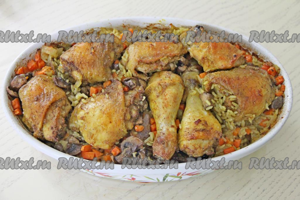 Достать форму с готовым блюдом из духовки. Рассыпчатый рис вместе сочными кусочками курицы и ароматными грибами в горячем виде подать к столу, дополнив, по желанию, свежими или маринованными овощами.