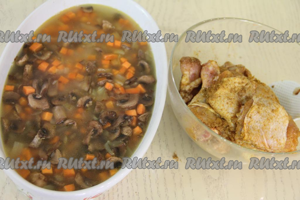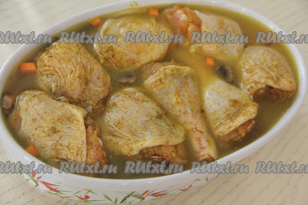 Выложить кусочки курицы. Поставить форму в разогретую духовку и готовить при температуре 200 градусов примерно 50 минут.