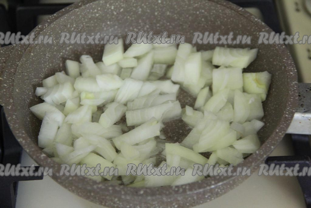 В сковороду влить растительное масло, поставить на огонь. В разогревшееся масло выложить лук, нарезанный на средние кубики, и обжаривать его на среднем огне минут 5 (до прозрачности), иногда помешивая.