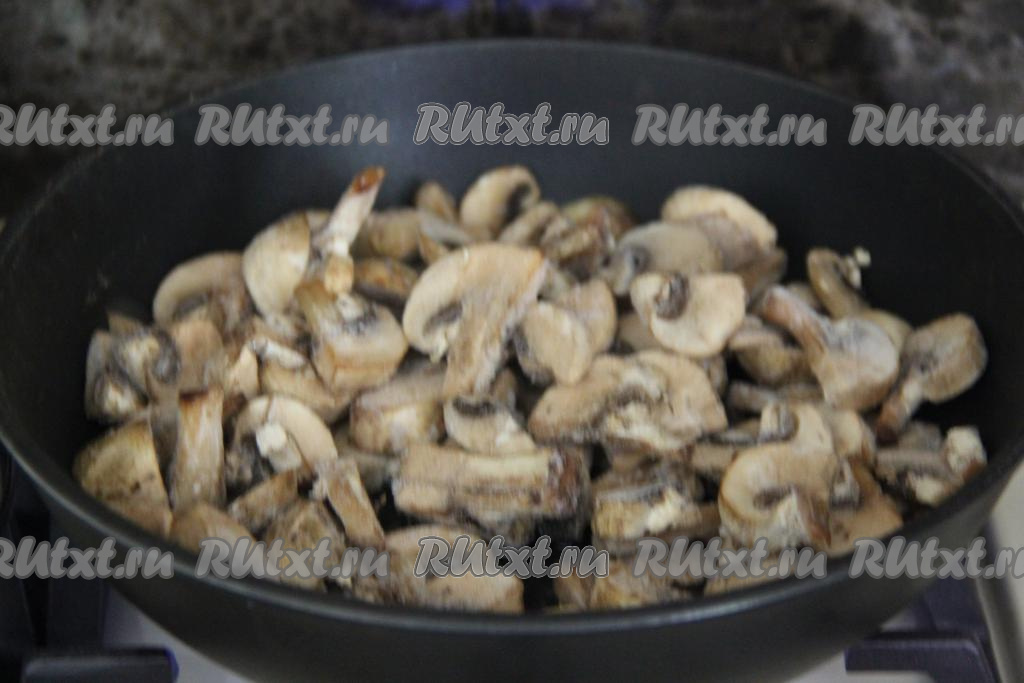 Если вы будете готовить это блюдо со свежими шампиньонами, тогда их нужно промыть водой, нарезать на пластины. Если же вы будете использовать замороженные нарезанные шампиньоны, тогда размораживать их не нужно. В отдельной сковороде разогреть масло, после этого выложить нарезанные свежие (или замороженные) шампиньоны, обжарить грибы, иногда помешивая, на среднем огне в течение 10 минут. Немного подсолить шампиньоны в процессе обжаривания.