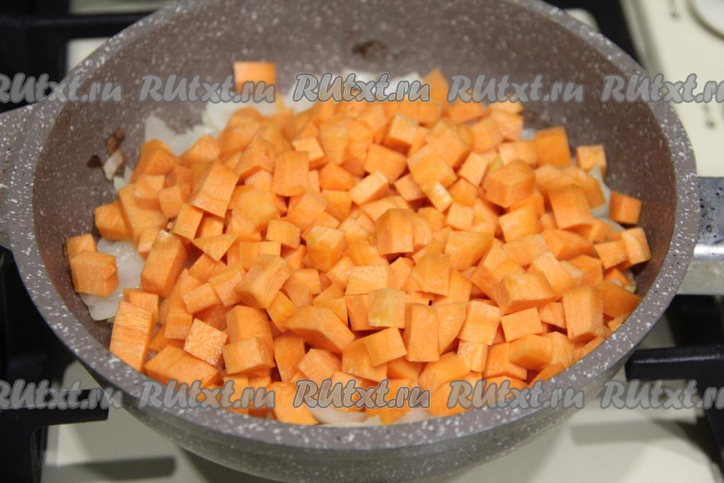 К обжаренному луку выложить морковку, нарезанную на мелкие кубики, перемешать и обжаривать овощи минут 5, периодически перемешивая.