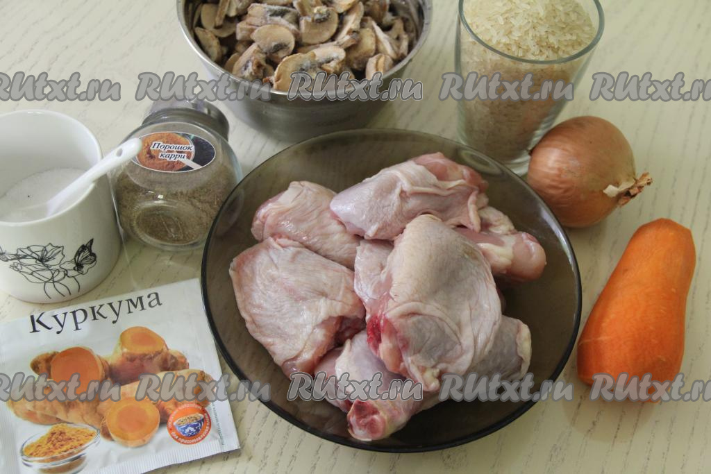 Подготовить продукты. Для этого блюда можно взять любые части курицы (например, ножки, бёдра или грудку). Лук и морковь почистить. Рис промыть водой, дать лишней жидкости стечь.