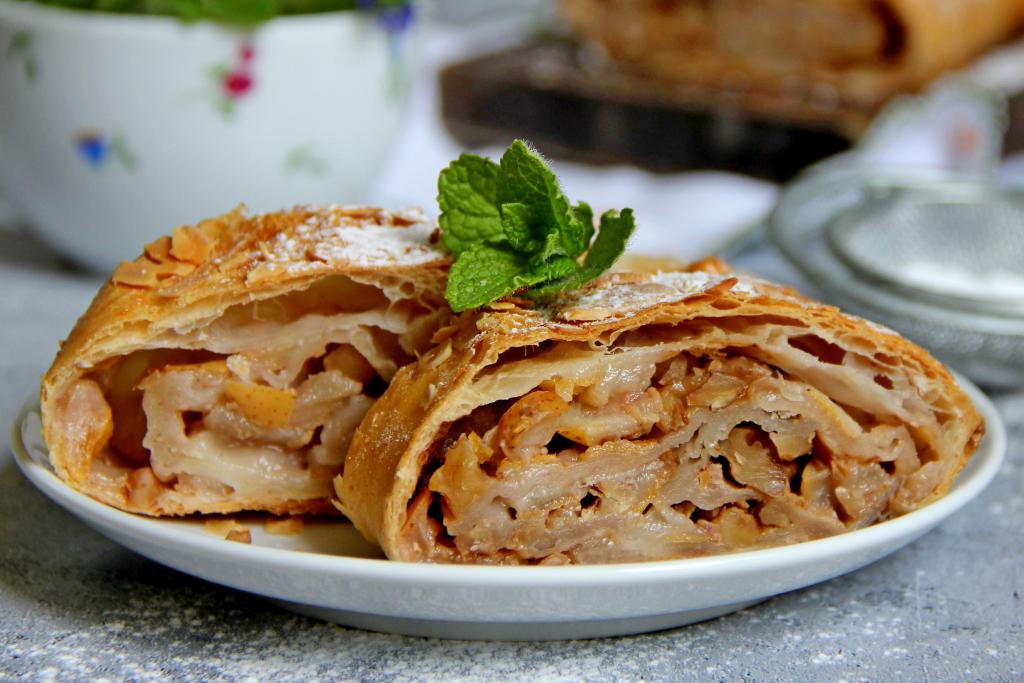 Готовый штрудель достать из духовки, слегка остудить, а затем нарезать на кусочки.