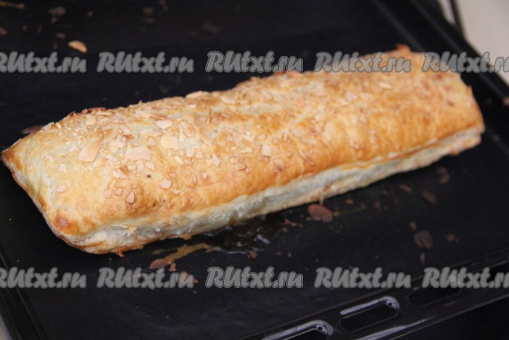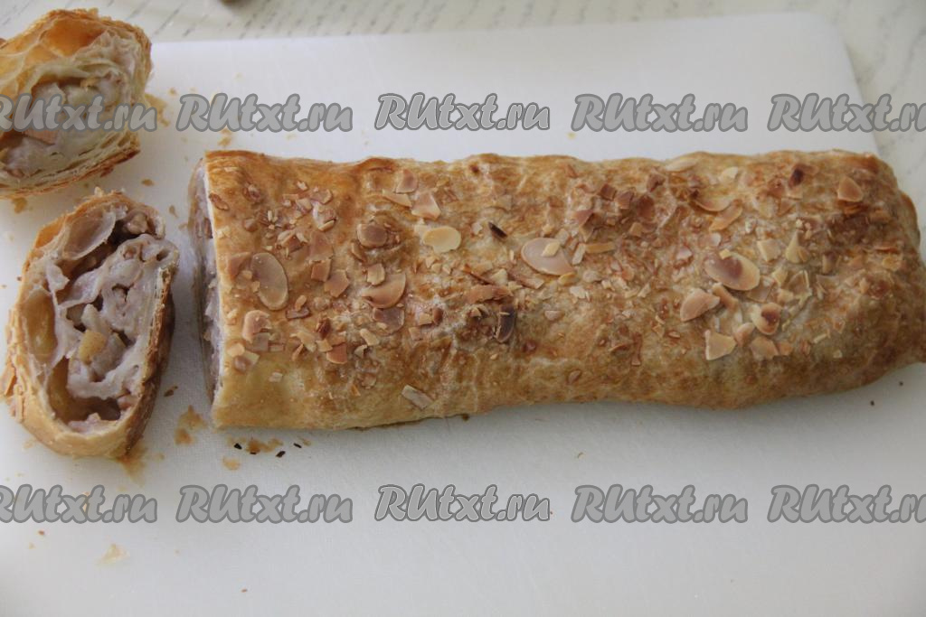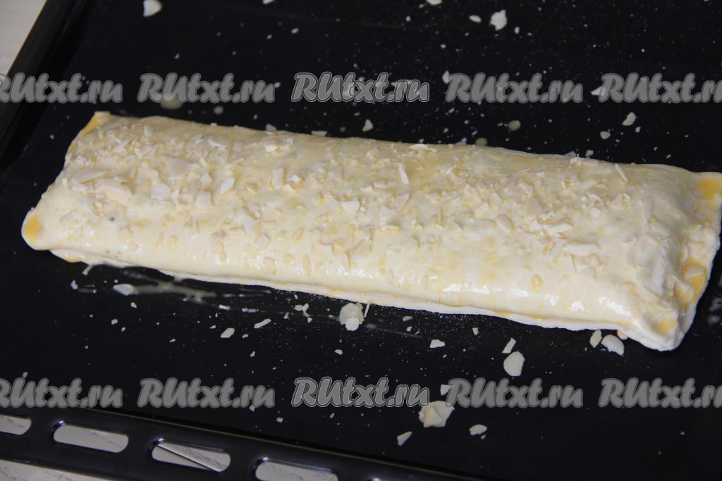 Смазать штрудель взбитым желтком. По желанию сверху рулет можно ещё присыпать лепестками миндаля.