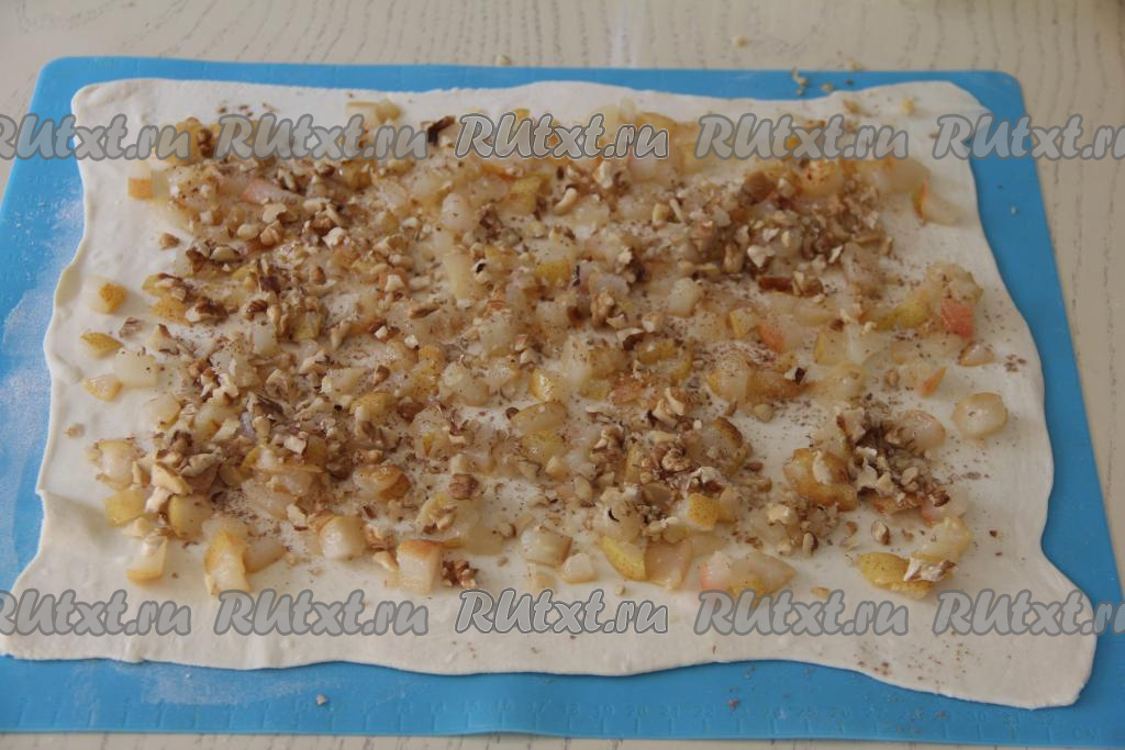 Выложить на тесто грушевую начинку, отступив от краёв по 1-2 сантиметра. Присыпать сверху начинку молотой корицей.