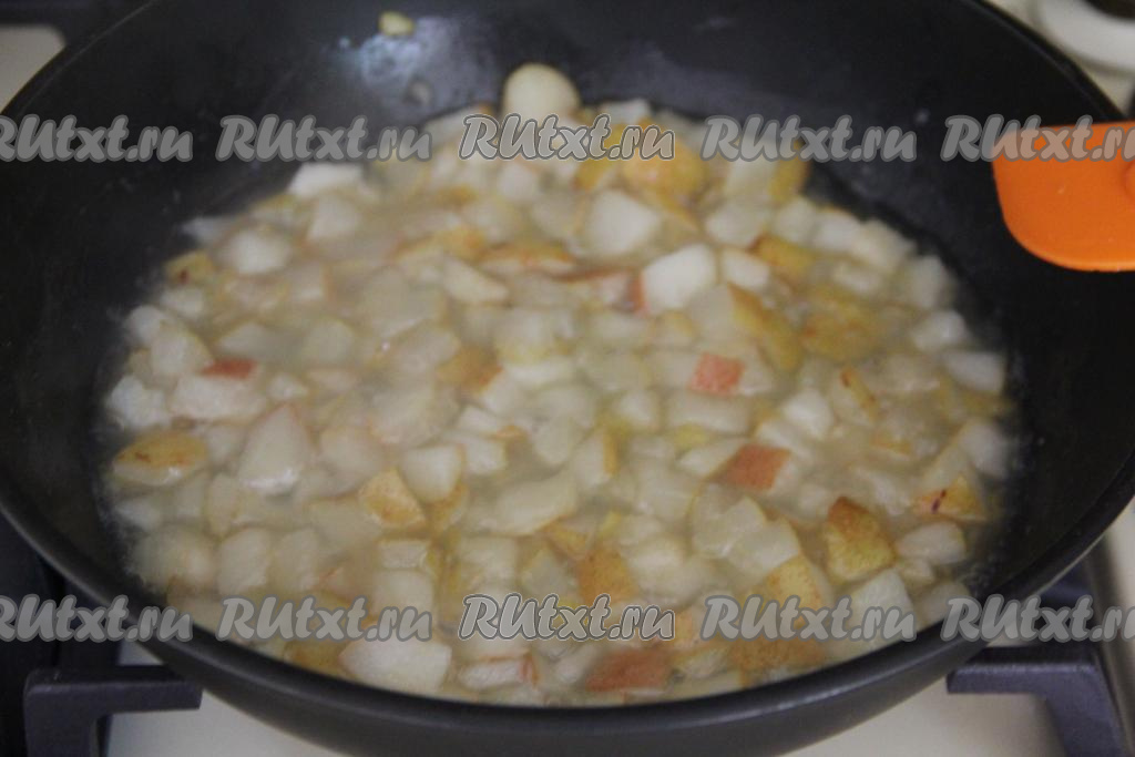 Томить груши в течение 7-10 минут на среднем огне, периодически перемешивая. Груши должны стать мягкими, но ещё держать форму.
