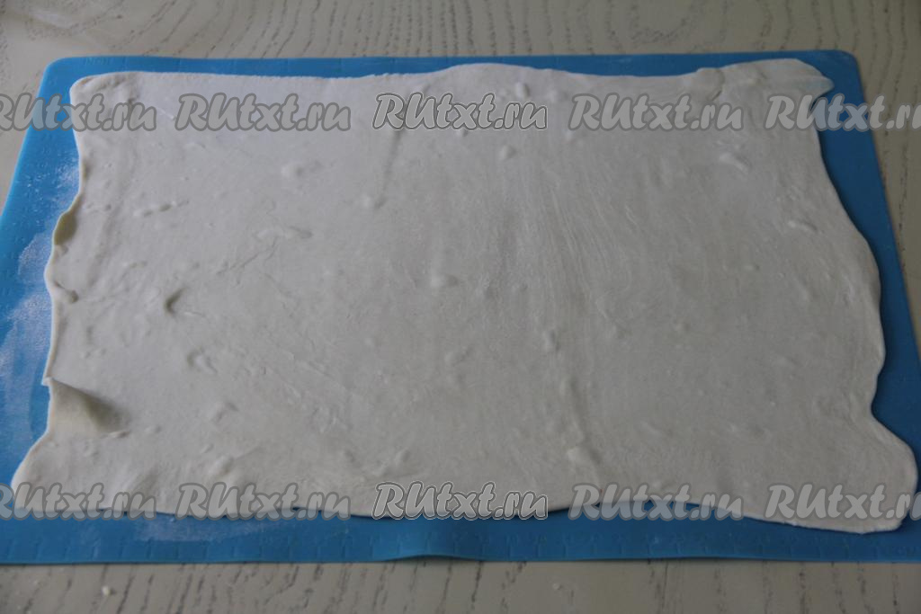 На припылённом мукой столе (или на силиконовом коврике) раскатать разморозившееся слоёное тесто в тонкий прямоугольный пласт толщиной около 2 миллиметров.
