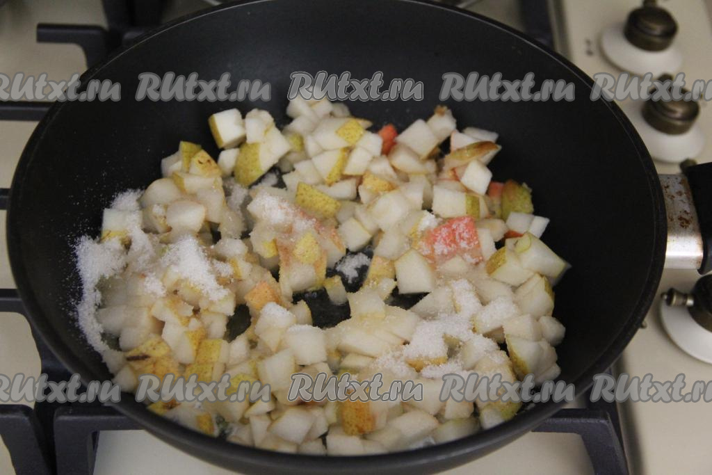 В сковороду выложить сливочное масло, добавить нарезанные груши и сахар, перемешать.
