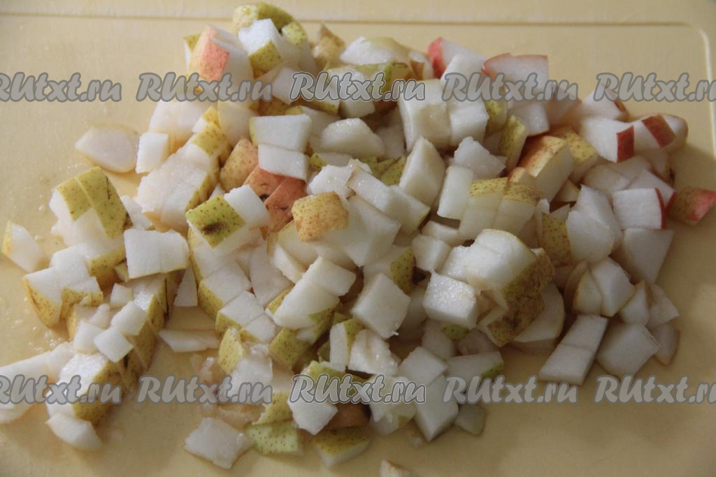 Нарезать груши на кубики размером примерно 1 сантиметр на 1 сантиметр.