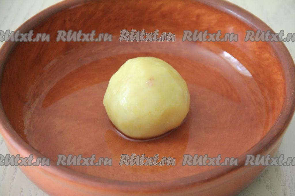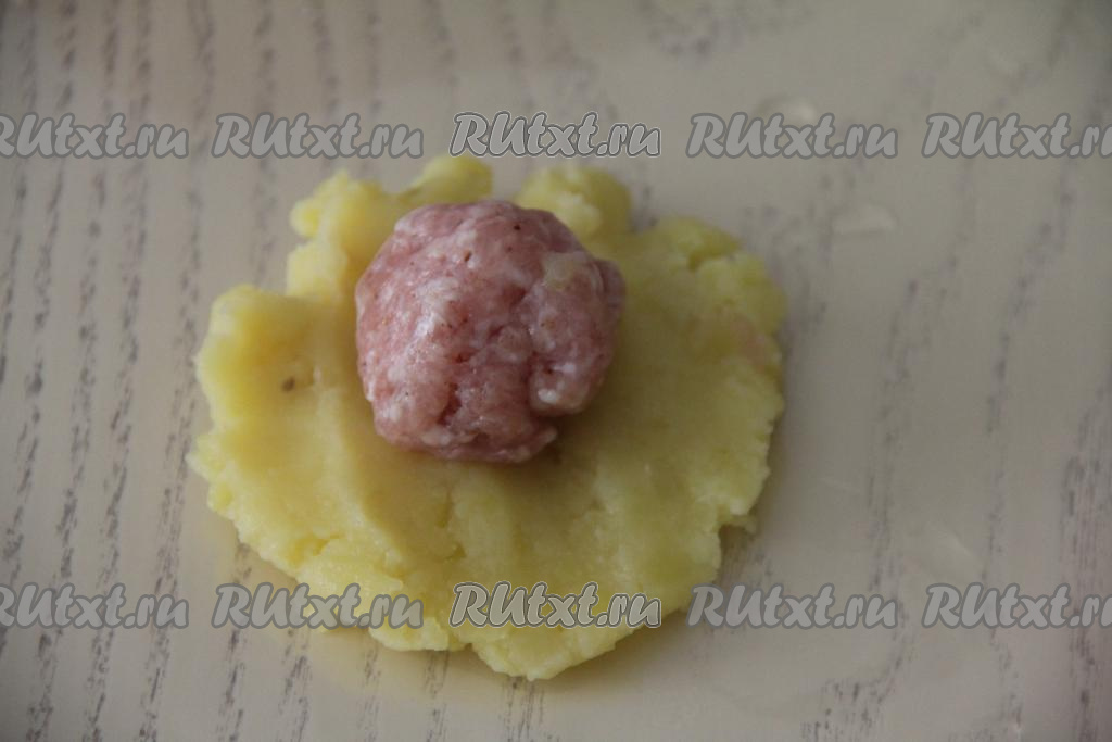 Из одной части картофельного пюре сформировать лепёшку, на середину выложить один шарик из фарша.